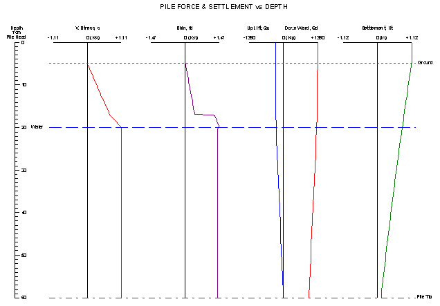 Results Output: Overburden stress, skin friction, uplift, downward, and settlement along pile length.