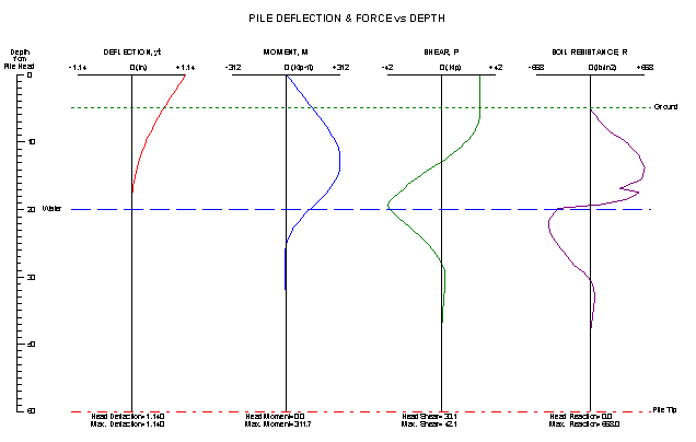 Results Output: Deflection, moment, Shear, and Resistance along pile length.